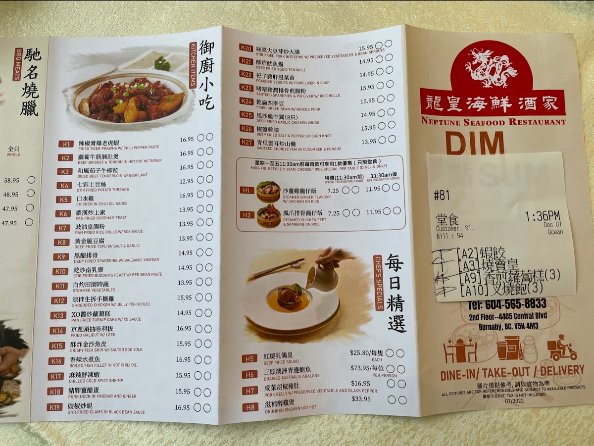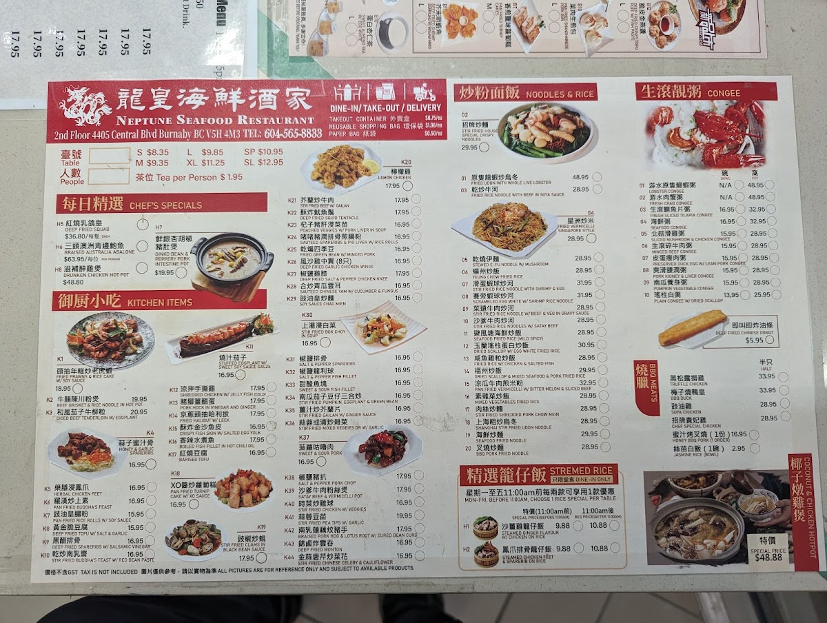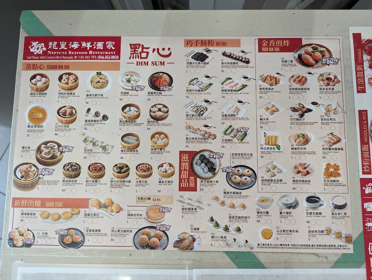 The menu at Neptune Noodle Bar in Burnaby offers a variety of traditional Chinese noodle dishes, congee options, and dim sum selections. It is structured into distinct categories to provide a clear overview of the available choices.