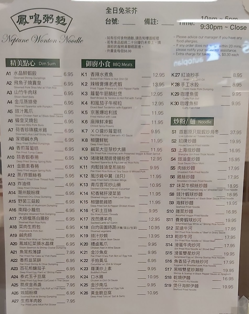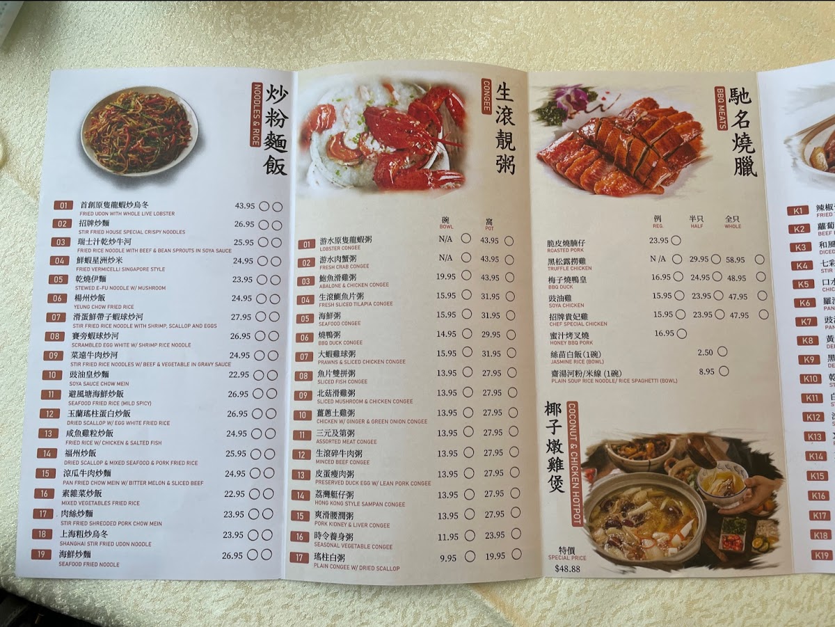 The menu is suited for quick and casual dining, offering hearty and comforting options commonly found in Chinese noodle shops and cha chaan teng-style eateries. Customers often choose from a mix of noodles, porridge, and dim sum depending on the time of day or meal preference. The menu accommodates a range of tastes through its variety of meat, seafood, and vegetable preparations.