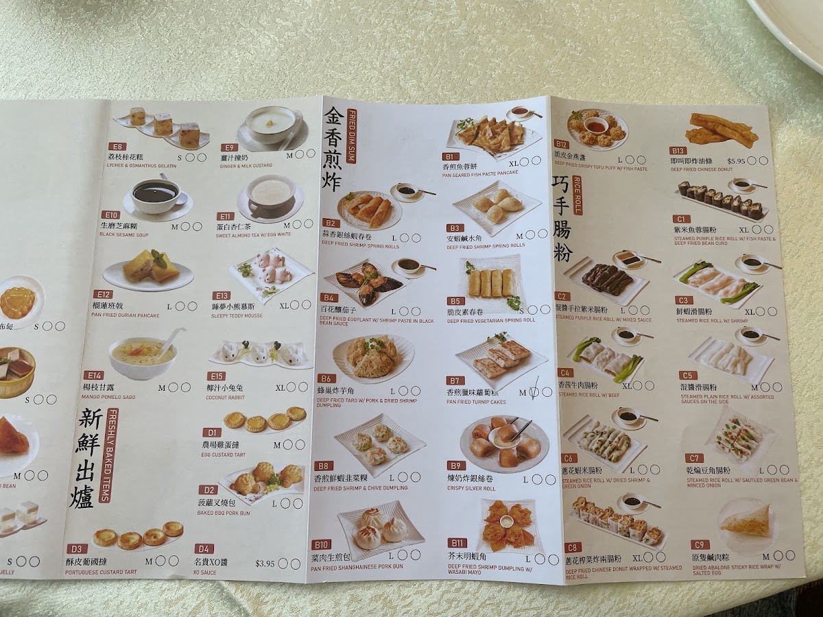 - Dim Sum (精美点心): The dim sum selection includes steamed and fried items such as Steamed Shrimp Dumplings, Steamed Pork Shao Mai with Fish Roe, Steamed Beef Balls, Steamed Chicken Feet in Black Bean Sauce, and Deep Fried Stuffed Dumplings. This section also features items like Steamed Lotus Leaf Sticky Rice and Pan Fried Turnip Cakes.
